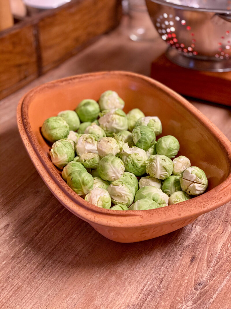 Den Strung der Rosenkohlröschen ein Stück mit einem kleinen Messer abschneiden. Welke, bzw. unschöne Blätter entfernen. Die Strungseite über kreuz etwas einschneiden und so mit den anderen Röschen verfahren. Diese Arbeit bleibt einem leider auch nicht bei der Zubereitung in einem Römertopf erspart. 🙂 In der Zwischenzeit den Deckel des Römertopfes wässern.